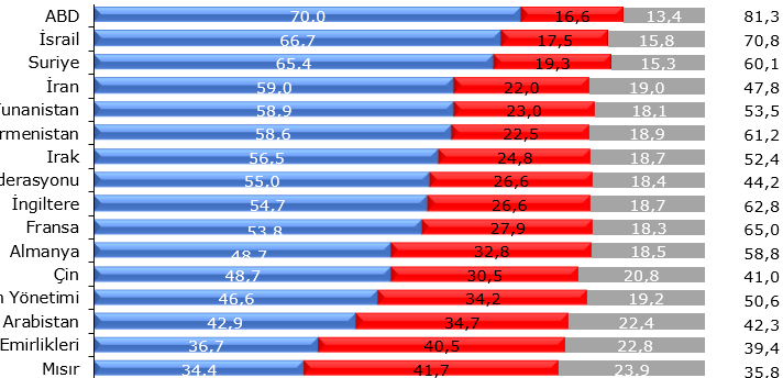 Ancak halkın dış politika algısını belirleyen en önemli etkenin Cumhurbaşkanı Erdoğan’ın çıkışları olduğu görülüyor. Erdoğan, örneğin geçen yıl ABD ya da İsrail’e yönelik çok sayıda demeç vermediği için tehdit algısı azalmış. Keza Almanya Başbakanı Angela Merkel’in Türkiye seyahati buzları biraz kırmış görünüyor. Ancak Erdoğan’ın Rusya eleştirileri algının Rusya lehine değişmesine neden olmuş.
