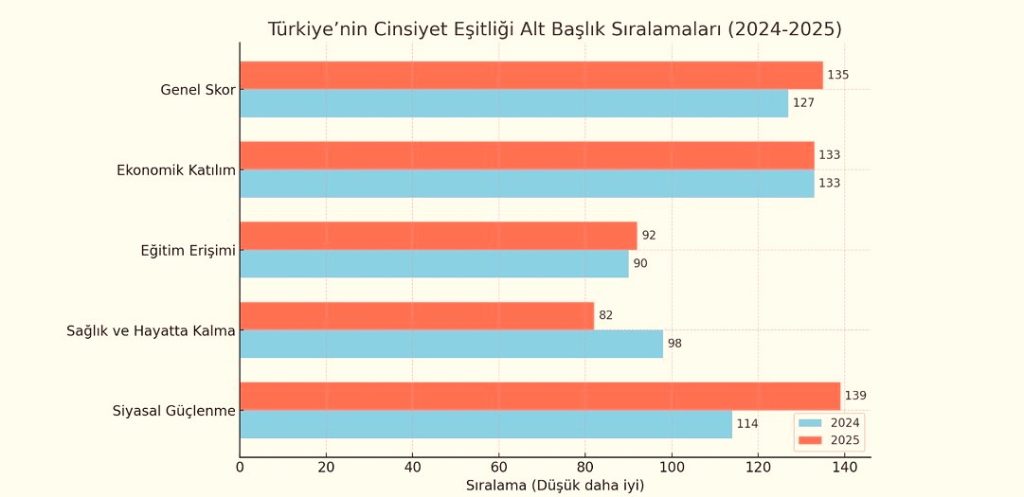 2024 yılında 127. sırada yer alan Türkiye, 2025 itibarıyla 8 basamak gerileyerek 135. sıraya düştü. Genel cinsiyet eşitliği skoru da yüzde 64,5’den yüzde 63,3’e geriledi. Bu düşüş, yalnızca Türkiye’nin yerinde saymasından değil; aynı zamanda diğer ülkelerin eşitlik yolunda ilerlemesinden kaynaklanıyor.