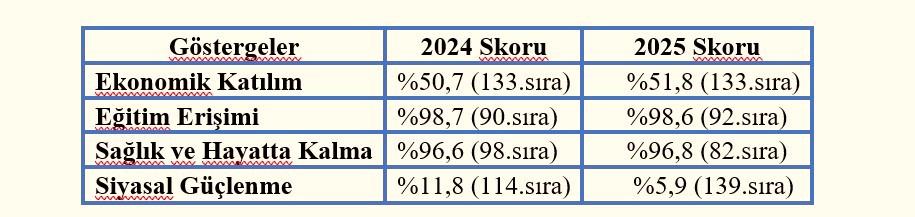 - Eğitim Erişimi: 2025 skoru yüzde 98,6 ile yüksek. Ancak meslek seçimi ve yükseköğretime erişimde cinsiyet bazlı farklılıklar sürüyor.