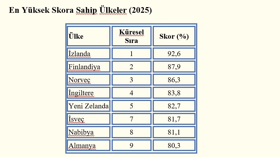 2025 raporunda Türkiye’yi geçen ülkeler arasında sadece Batı demokrasileri değil; Suudi Arabistan, Birleşik Arap Emirlikleri, Endonezya, Özbekistan, Türkmenistan, Tacikistan, Kırgızistan gibi ülkeler de yer alıyor.