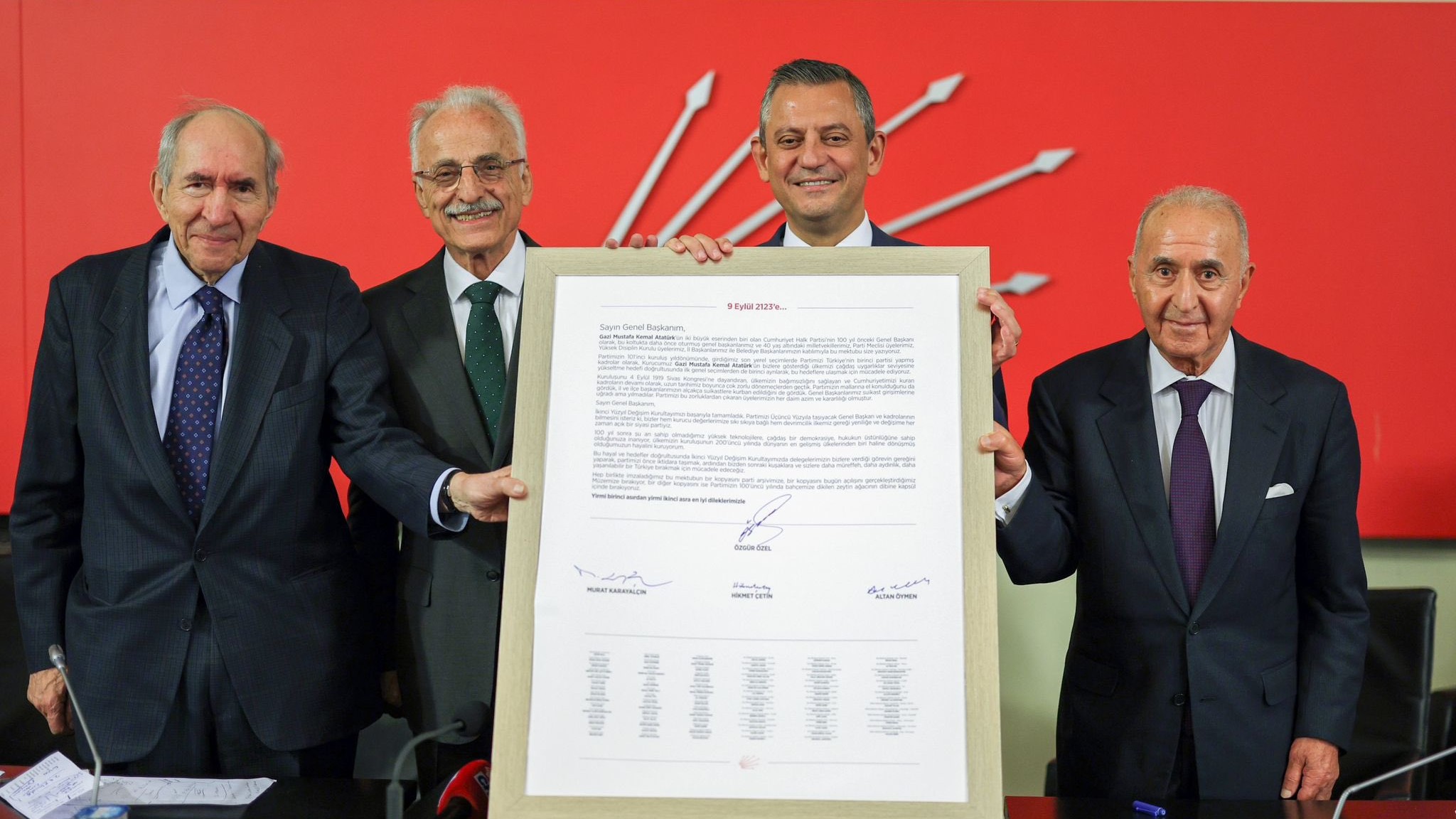 Üç önceki CHP Genel Başkanı, soldan sağa Altan Öymen, Murat Karayalçın ve en sağda Hikmet Çetin, Genel Başkan Özgütr Özel’le birlikte CHP’nin 200’üncü yılında, 9 Eylül 2123’te açılmak üzere CHP Genel Merkezinin bahçesine gömülecek kapsüle konacak metni imzaladıktan sonra görülüyor. (Foto: CHP)