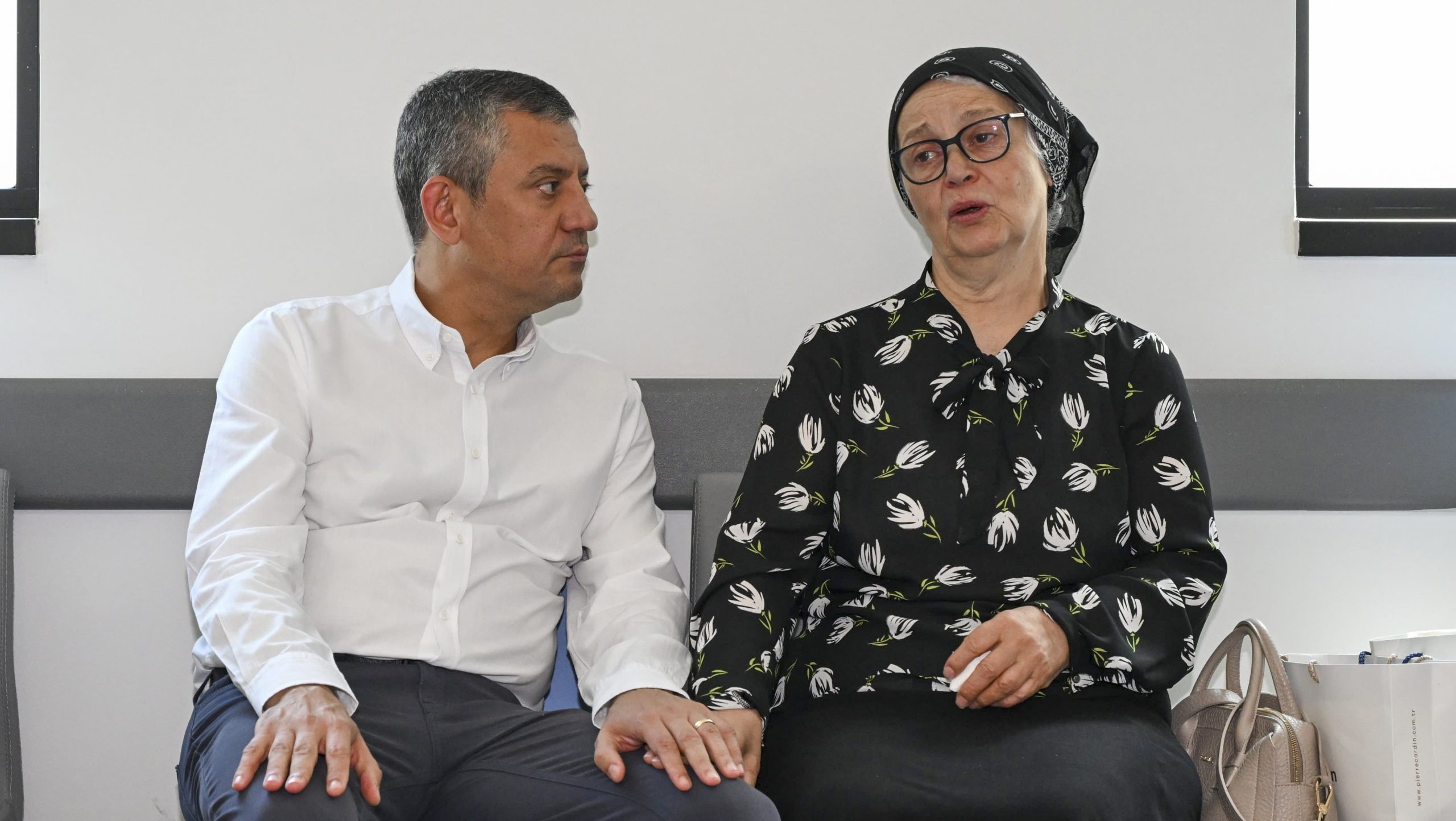 CHP lideri Özgür Özel, tutuklu Beylikdüzü Belediye Başkanı Mehmet Murat Çalık’la hastanede görüşmesine aracı olduğu annesi Gülümser Çalık ile görülüyor.