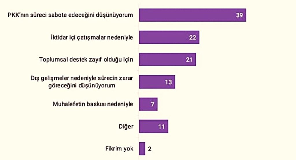 Anket verileri, “Terörsüz Türkiye” sürecinin sekteye uğrayacağını düşünen katılımcıların en büyük endişesinin doğrudan PKK kaynaklı olduğunu gösteriyor. Bu gruptaki katılımcıların yüzde 39’u, sürecin PKK tarafından sabotaj girişimlerine maruz kalacağını öngörüyor. Bu oran, diğer tüm sebeplerden belirgin biçimde daha yüksek ve güvenlik boyutunun hâlâ sürecin en kırılgan alanı olarak görüldüğünü ortaya koyuyor.