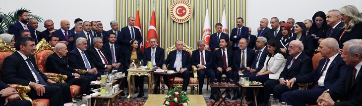 Erdoğan’ın konuşması durgun ama ortam gergindi. Tam karşısında, boş kalan CHP sıralarından gözlerini kaçırıp solundaki AK Parti ve sağında kalan MHP ve DEM gruplarına dönüyordu hitabında.