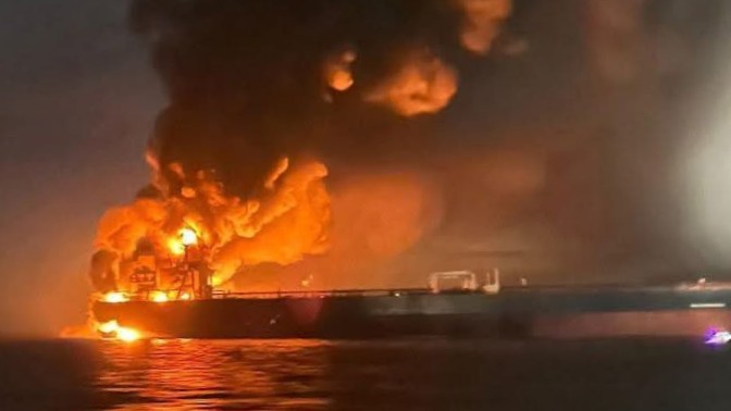 Ukrayna’nın Rusya’nın petrol ambargosunu delmek için “Gölge filolda” kullandığı iddiasıyla Türkiye açıklarında İnsansız Deniz Aracıyla (İDA) vurduğu Gambiya bayraklı Kairos tankeri yanarken görülüyor. (Foto: Denizcilik Genel Müdürlüğü)