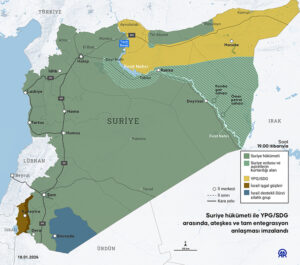 Suriye ordusunun iki haftadır askeri operasyonda SDG güçlerini geriletmesi ardından, Suriye Cumhurbaşkanı Ahmed Şara, 18 Ocak akşam saatlerinde Suriye’nin Kuzeydoğusunda SDG ile ateşkese vardıklarını duyurdu. Ateşkes anlaşmasına göre SDG bölgedeki tüm sınır geçiş noktaları, petrol ve doğal gaz sahalarının kontrolünü ele alacak, tüm askeri ve güvenlik personeli de Suriye Savunma ve İçişleri Bakanlıklarının yapısıyla bütünleştirilecek. Suriye makamlarına göre SDG bu anlaşmayla, Türkiye’nin de talebi olan, Suriyeli olmayan PKK lider ve üyelerinin sınır dışı edilmesi sözü de veriyor.