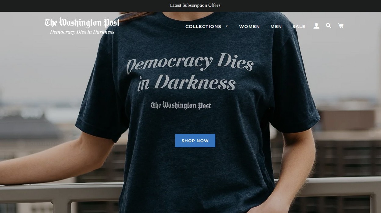 The Washington Post’un “Demokrasi Karanlıkta Ölür” sloganı şimdi işten çıkarılan gazeteciler tarafından acıklı bir protesto olarak kullanılıyor. (Görsel: WP tişört satış sayfasından ekran görüntüsü.)