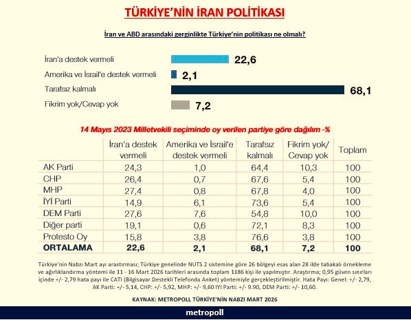 Deneklerin yüzde 68,1’i “tarafsız kalmalı” derken, yüzde 22,6’sı İran’dan yana, yüzde 2,1’i ise Türkiye’nin ABD-İsrail’den yana durması gerektiğini söylemiş; gerisinin fikri yok.