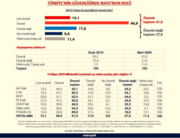 Bir kısım siyaset yorumcularının ezberini bozabilecek yanıtlarsa, Türkiye’nin güvenliğinde NATO’nun rolü sorusu üzerine verilmiş. Önemli toplamı yüzde 61,0. Önemsiz toplamı ise 27,6.
