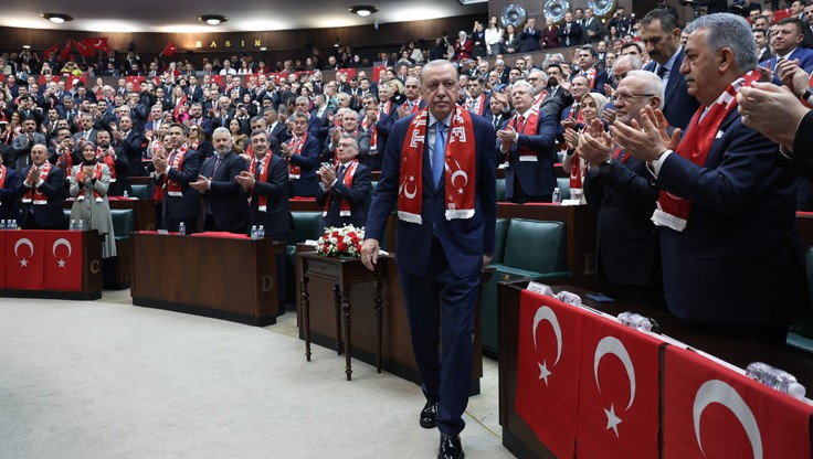 Cumhurbaşkanı Erdoğan’ın son konuşması Türkiye’nin İran savaşının uzayarak Sünni-Şii çatışmasına dönüşmesinden kaygısını gösteriyor. AK Parti grubundaki Türk bayrakları ve atkılar, Türk millî futbol takımının Kosova’yı yenerek Dünya Kupası’na katılma hakkı kazanmasını kutlama amaçlı. (Foto: Cumhurbaşkanlığı)
