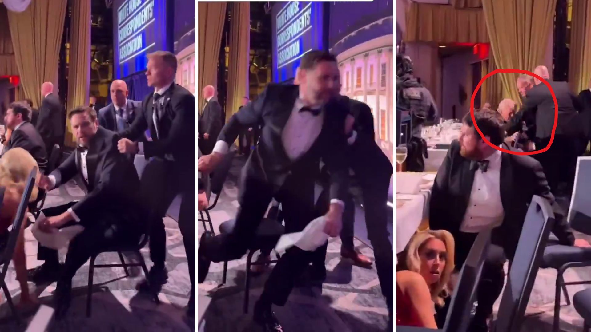 Silah seslerinin duyulmasıyla birlikte korumaların ABD Başkan Yardımcısı JD Vance’i apar topar dışarı çıkarırken Başkan Trump’ın hâlâ oturmakta olduğu görülebiliyor. (Görsel düzenleme: www.dire.it)